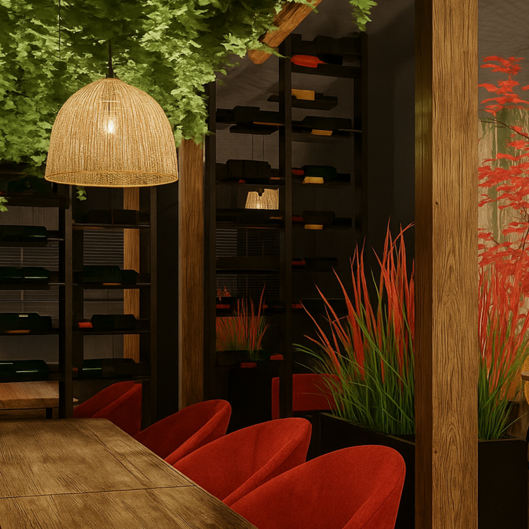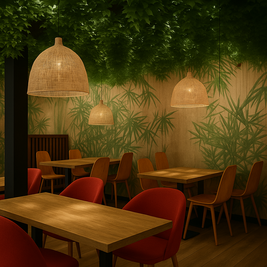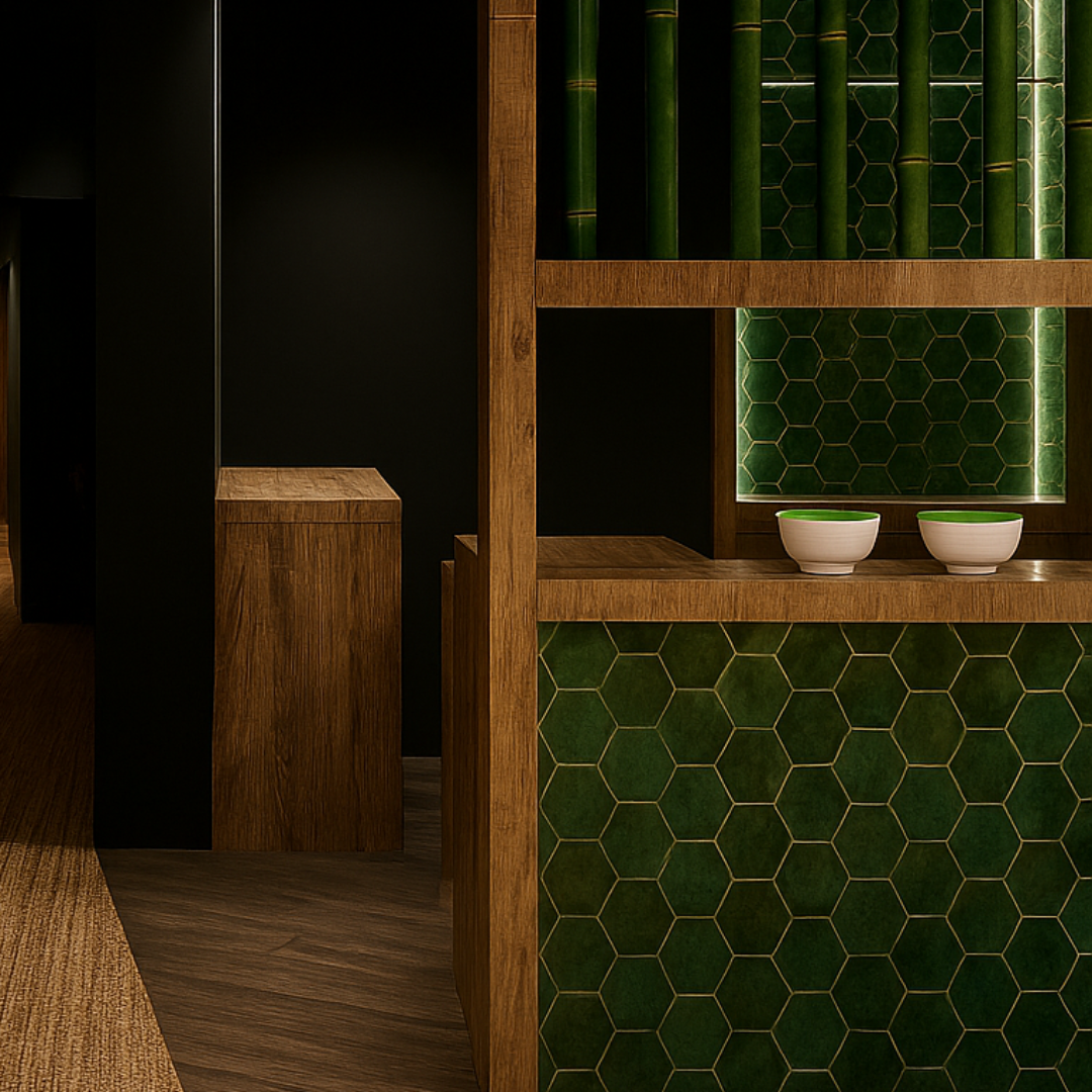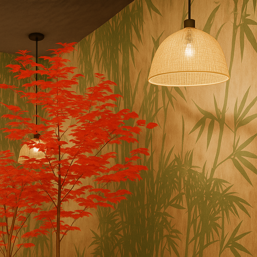 Voor het interieur is bewust gekozen voor de herfstperiode, een seizoen vol rijke, levendige kleuren die direct doen denken aan de adembenemende Japanse herfstlandschappen. Naast de serene groene basistonen zorgen de warme tinten rood en geel voor een opvallend contrast, wat een authentieke en energieke sfeer creëert. Het kleurenpalet belichaamt de harmonie en balans die kenmerkend zijn voor Japan, terwijl het ook een spannende en mysterieuze sfeer oproept, passend bij de betekenis van de natuurlijke omgeving binnen de Japanse cultuur.