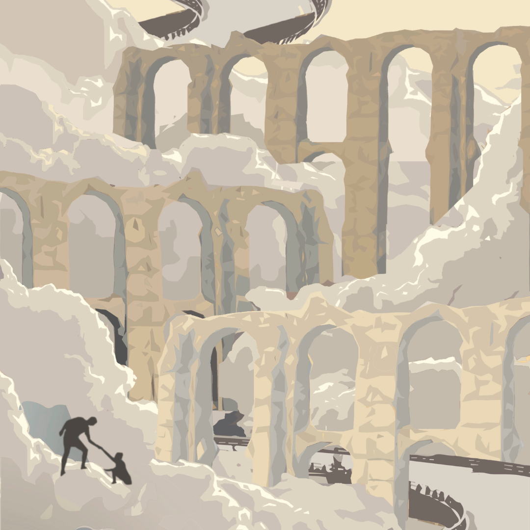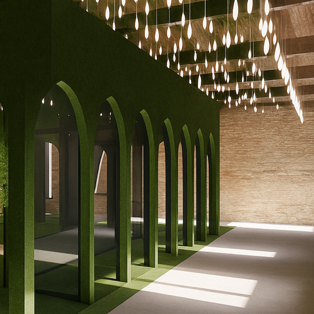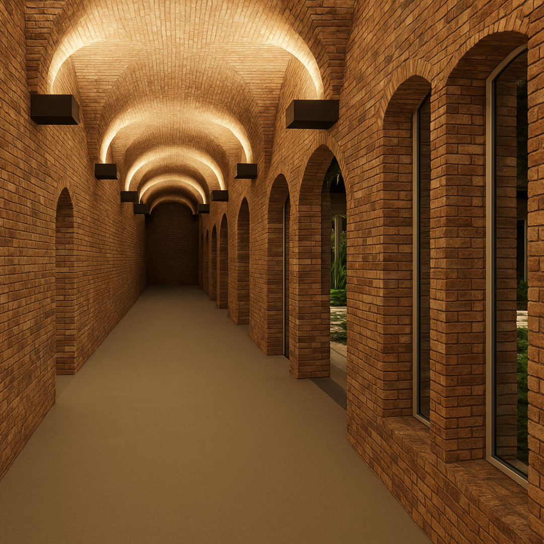 Zuilen en boogconstructies – symboliseren perspectief, waar geloof en intellect samenkomen, geïnspireerd door Renaissance-architectuur.